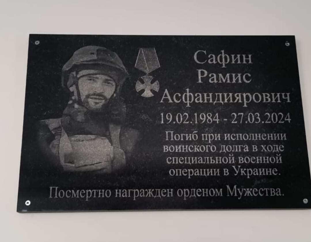 Мемориальная доска участнику специальной военной операции с надписью «Сафин Рамис Асфандиярович 19.01.1984-27.03.2024 Погиб при исполнении воинского долга в ходе специальной военной операции в Украине». Посмертно награжден орденом Мужества.