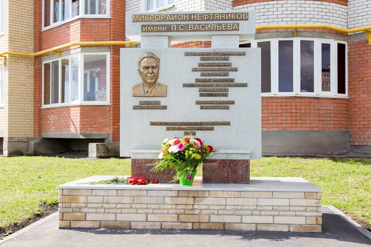 Памятная плита установлена в год празднования 70-летия НГДУ «Лениногорскнефть»(2015). Павел Степанович Васильев начальник НПУ «Бугульманефть» (10.1952 – 04.1960 годы), награжден орденами: Ленина, Трудового Красного Знамени, «Знака Почета» и медалями, Лауреат Ленинской премии. Почетный гражданин г. Лениногорска с 1980 года. С именем Павла Степановича связана история появления множества социальных объектов города – каскад озёр, лесопарковая зона (построена ротонда, дорожка к ней), установлена телевизионная вышка, открыта вечерняя школа, организована команда по хоккею с мячом, построен каток. Сегодня именем П.С.Васильева назван новый микрорайон современных многоэтажек в городе Лениногорск.